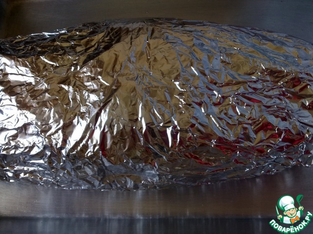 - Через два часа достать, снять пленку и завернуть свинину в фольгу таким же способом. Блестящая сторона должна быть внутри;