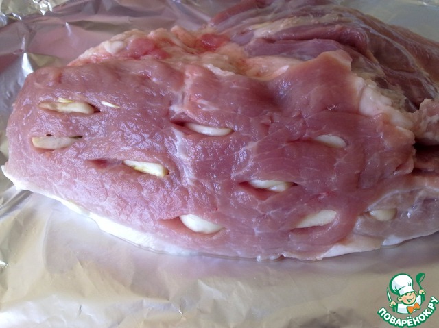 Форму для запекания застелить фольгой. Мясо промыть и хорошо обсушить. Выложить окорок в форму на фольгу жиром вниз. Чеснок очистить и нарезать на кусочки. На мясе сделать небольшие надрезы, нашпиговать окорок со всех сторон чесноком.