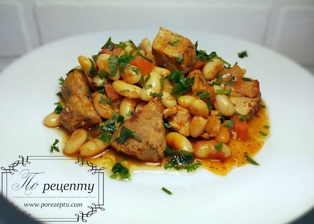 Сегодня я хочу вам показать, как готовится тушеная фасоль со свининой в томатном соусе на сковороде пошагово с фото.