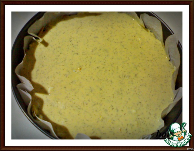 Теперь традиционный шаг: выливаем часть теста в форму, уложить начинку, залить тестом.