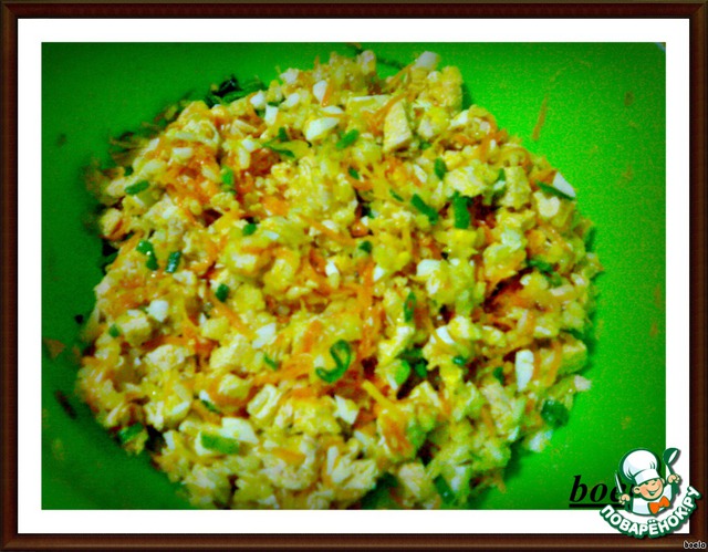 - Мелко шинкуем зелёный лук. Курицу избавляем от шкур и костей, затем измельчаем.