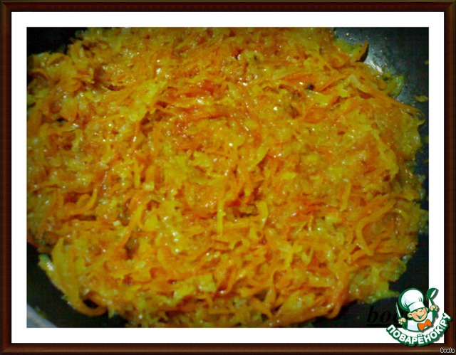 Натереть морковь, нарезать тоненько лук и обжарить отдельно от фарша. Солим, перчим и помешиваем.