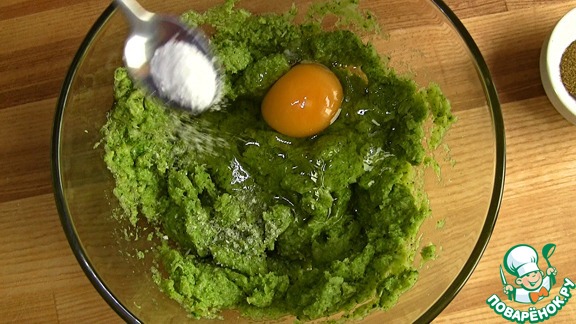 - Добавьте яйцо, муку, соль и перец, и тщательно перемешайте.
