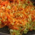 4.На сковородке накалить постное масло. Очистить луковицу и порезать ее мелким кубиком. Подрумянить в масле пару минут. Тем временем, натереть морковку и отправить тоже в сковороду. Жарить еще минуты две. Добавить томатную пасту, немного говяжьего бульона, буквально один половник, и все размешать.