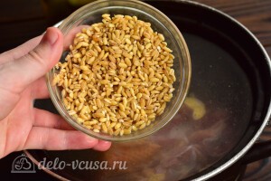 Выложите перловку в кастрюлю. Отправьте ее на сильный огонь. Когда вода закипит, убавьте огонь до минимального, соберите пену. Варите бульон на умеренном огне в течение 40 минут.