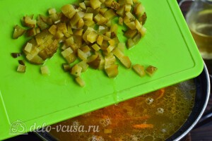 Через 15 минут выложите зажарку в рассольник. Влейте рассол.