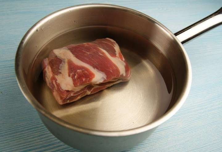 Дальше мы будем заниматься мясом. Его нужно отварить в течении часа. Затем мясо следует вынуть из бульона, немного остудить, а затем нарезать кусочками среднего размера. Полученный бульон необходимо процедить и перелить его в глубокую кастрюлю.