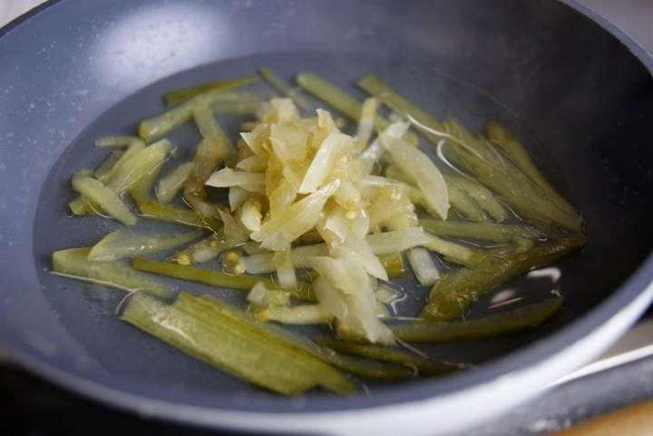Соленые огурцы и помидоры также следует протушить на сковороде в течение двадцати минут, вот только сделать это нужно отдельно от всех прочих овощей.