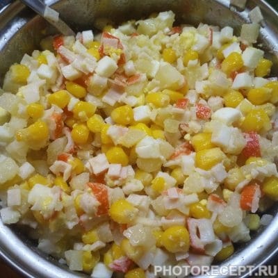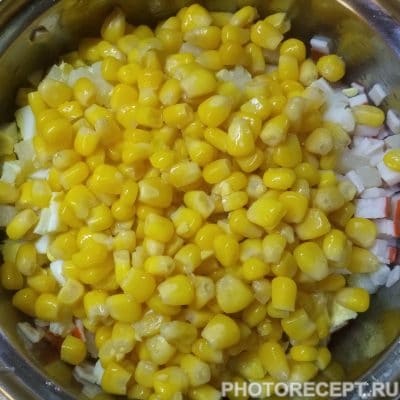 Предварительно сливаем из банки с консервированной кукурузой всю жидкость. Выкладываем в общую емкость картофель, крабовые палочки, кукурузу, яйца. Тщательно смешиваем все ингредиенты.