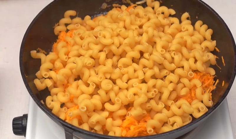 7. Промытые макароны выкладываем в сковороду к обжаренному луку с морковью. Перемешиваем. Обжариваем.