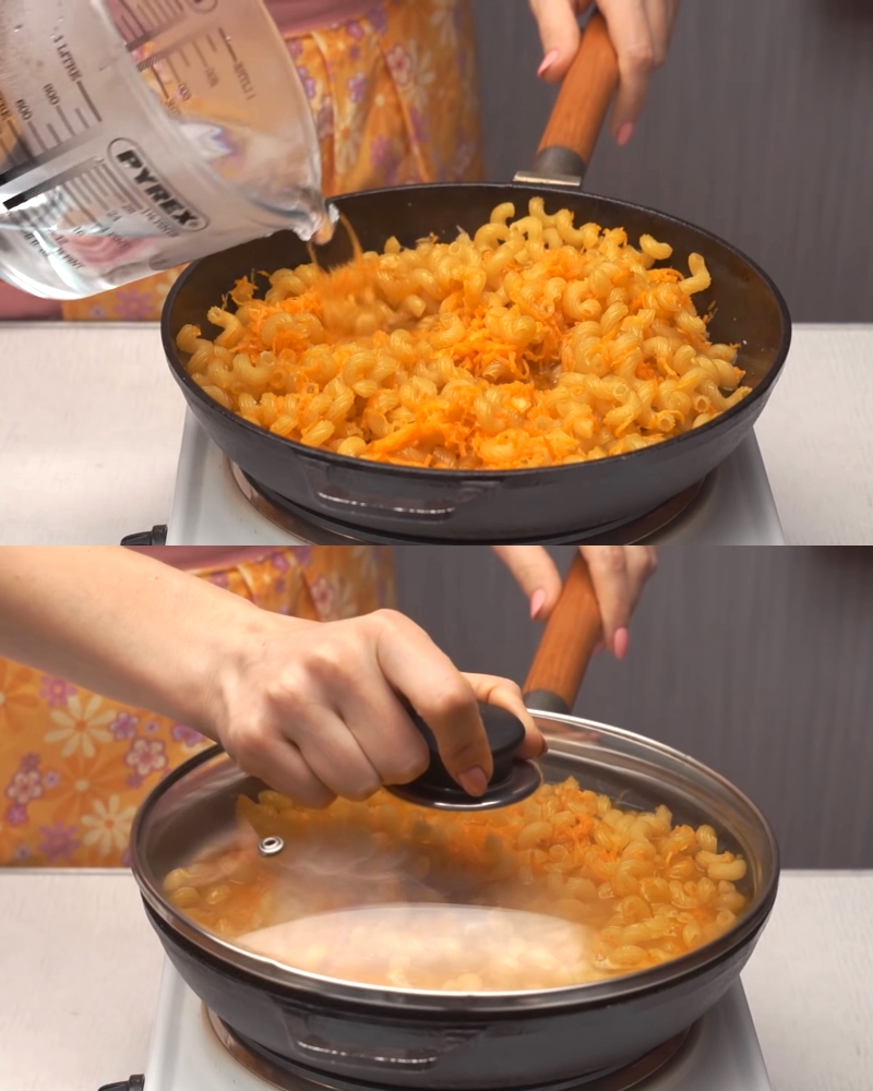 Влей в макароны с морковью 500 мл кипятка, накрой крышкой и туши на медленном огне 15 минут до мягкости.