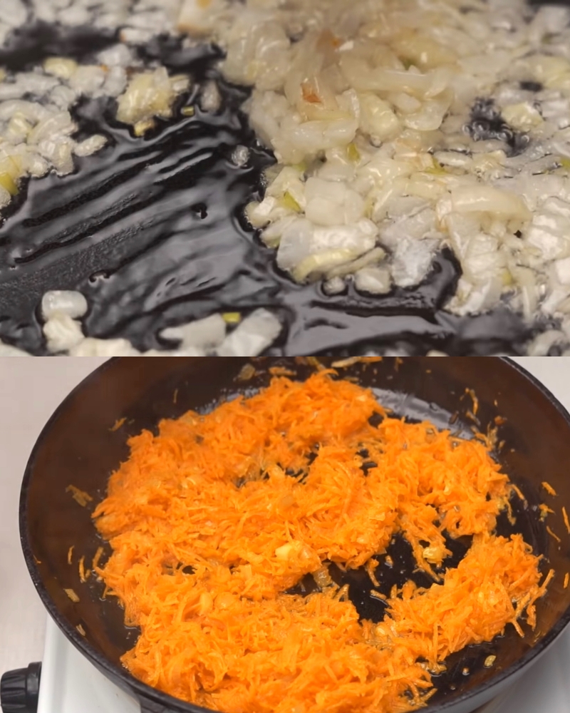 Разогрей на сковороде растительное масло и брось сначала обжариваться лук, затем через пару минут морковь.