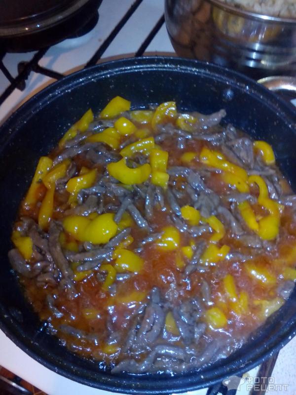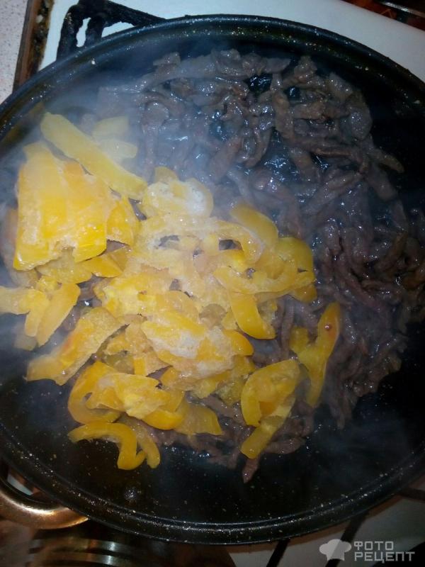 Затем добавить перец и морковь, снова подсолить. Я еще добавила немного острого перца, но это по желанию. Прожарить все вместе 7 минут и влить пол стакана воды. Закрыть крышкой и потушить до мягкости овощей и мяса.