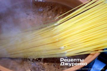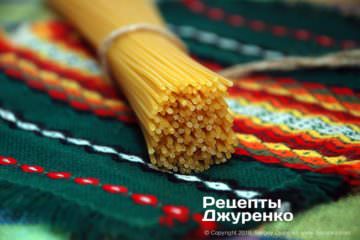 В большом количестве подсоленной воды сварите спагетти. Время варки зависит от конкретного сорта, так что справляйтесь о нем на упаковке.