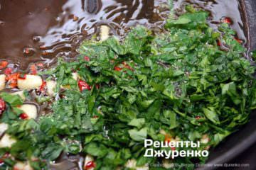 В сковородку с маслом положим измельченный чеснок, поджарим до золотистого цвета, а потом остудим и вместе с маслом добавим к пасте. Перемешаем, а в сковородку, в которой готовили чесночное масло, добавим нарезанный салат (можно и другую зелень). Потомим минут 7, потом вместе с орешками добавим к пасте.