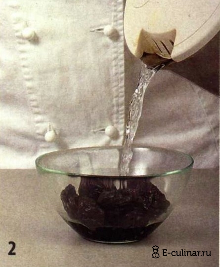Замочить чернослив в кипятке. Слить воду и мелко нарезать.
