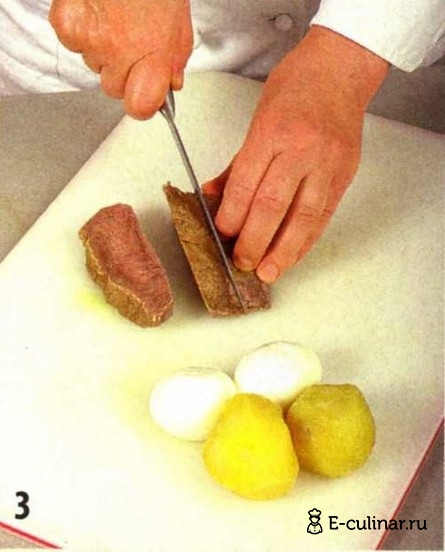 Приступим к готовке. Готовка этого блюда в домашних условиях может быть быстрой, если вы купите уже отваренное мясо. Если вы приобрели сырое говяжье филе, то правильно действовать на кухне вам поможет следующая инструкция: