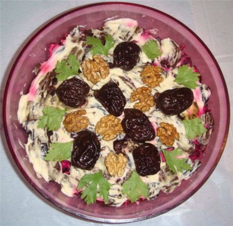Многослойный салат с отварным мясом, морковью, свеклой, картофелем и черносливом, заправленный майонезом и украшенный черносливом, грецкими орехами и зеленью.