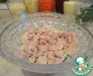 - При варке в бульон можно добавить ароматные травы и специи, не забыть посолить воду, чтобы мясо было также немного соленым. После того, как волокна размягчатся, нужно остудить кусочек, а затем нарезать ножом на некрупные сегменты. Выложить подготовленное мясо на плоское блюдо, промазать заправкой из майонеза, как и другие слои кушанья.