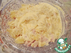 - В майонез добавить очищенные от шелухи дольки чеснока, пропущенного через пресс, каждый слой салата в последствии промазывать данным соусом.