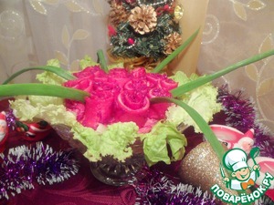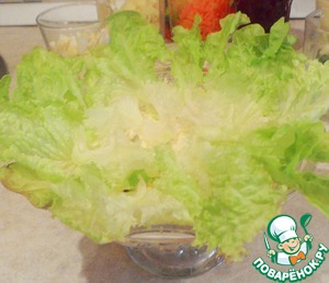 - Сверху выложить тертую свёклу. Аккуратно выровнять вершину, смазать майонезом, дать настояться блюду несколько часов в холодном месте.