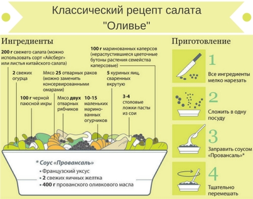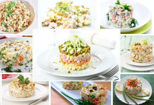 Салат этот для многих является символом Нового года. А в советские годы вообще ассоциировался с благополучием и достатком, поэтому редкое застолье обходилось без него. Изначально, как уже было сказано выше, его создателем являлся повар из Франции Люсьен Оливье. Готовился он из разных видов рябчиков, телячьего языка, раков, смеси маринованных овощей, свежих огурцов, картофеля, каперсов и яиц, заправленных соусом Провансаль.
