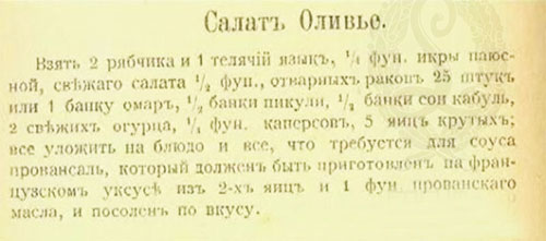 Бытует мнение, что прекрасный французский повар, творивший в московском ресторане «Эрмитаж», не поделился своим рецептом приготовления салата, тем не менее, в конце XIX столетия салат Оливье готовили так. Сегодня можно заменить одни продукты на другие и приготовить Оливье по-старинному рецепту в приближенном варианте.
