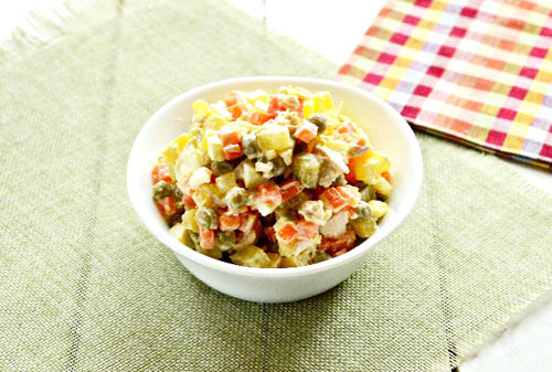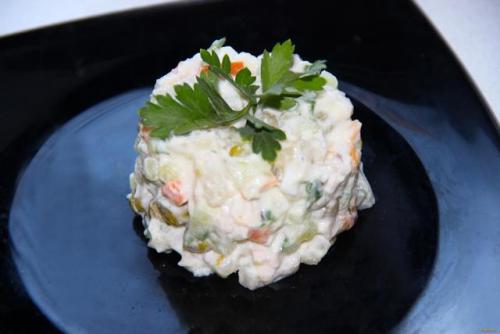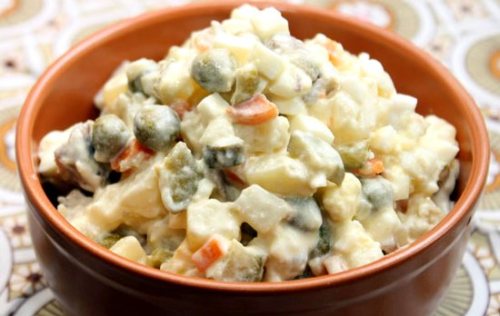 Диетический вариант имеет довольно гибкую рецептуру, в зависимости от собственных предпочтений, вы можете изменять состав оливье под свой вкус.