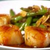 Гребешки разморозить, положив в холодильник, потом промыть и вытереть бумажным полотенцем. Морские гребешки порезать кусочками и выложить на сковороду к имбирю с чесноком. Жарить все это следует около 4 минут, с обеих сторон. Кинзу добавить на сковороду и влить бальзамический уксус. Жарить все необходимо около 10 минут, только постоянно помешивая, пока вся эта смесь не карамелизуется.