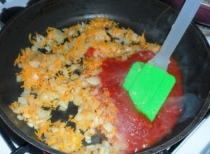 Нарезать лук кубиками и поставить на сковородку с разогретым растительным маслом для пассеровки, когда лук станет прозрачным добавить морковь, натертую на средней терке, немного тушить и добавить томат, мешать.