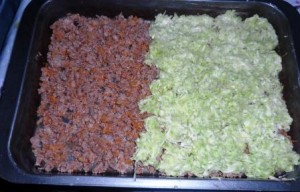 - Выложить половину кабачковой массы, затем весь фарш и вторую половину кабачков.