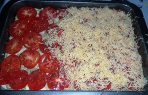 - Сверху разложить ломтики помидоров. Залить все заливкой.